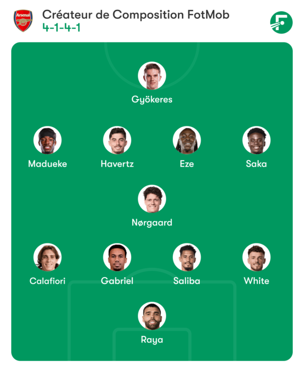 Voici l'équipe que je souhaiterais voir pour ma part : Raya White (si fit) - Saliba - Gabriel - Calafiori Nordguard Havertz - Rice Madueke - Gyo - Eze