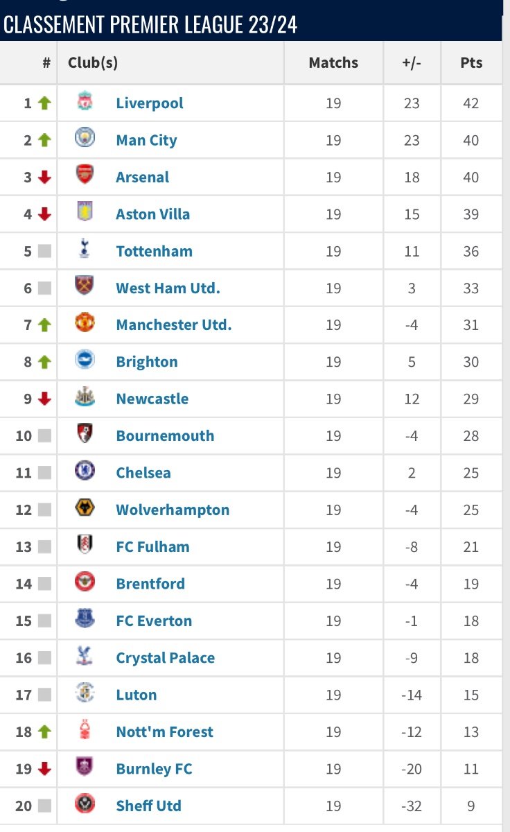 Quelqu'un aurait le classement en 2023 2024 après 19 journée aussi ? Il me semble qu'on avait une plus grande avance sur City. -