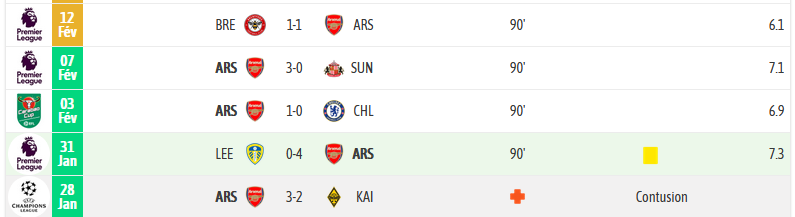 Yes je te rejoins sur le fait qu'il a eu des soucis physiques cette saison, mais il y a très certainement plusieurs matchs auxquels il aurait pu participer 15-20 minutes pour faire souffler Timber, et ça n'a presque jamais été le cas. Ou pour apporter un second souffle et quelque chose de nouveau. En terme de niveau, White et Timber c'est relativement similaire d'après moi, même si ils ont des qualités et des profils très différents. Regarde le suivi ci-dessous. White fait le banc 4 matchs de suite début février sans monter au jeu. Il y a certainement un moment où il aurait pu apporter quelque chose d'après moi. Pendant ce temps là, qui est ce qui s'est gaufré la totalité de la rencontre à chaque match ? Timber. Alors je ne suis pas préparateur physique, mais se taper 4 matchs complet en 13 jours contre des équipe de PL, j'ai du mal à imaginer que cela ne laisse pas de traces.
